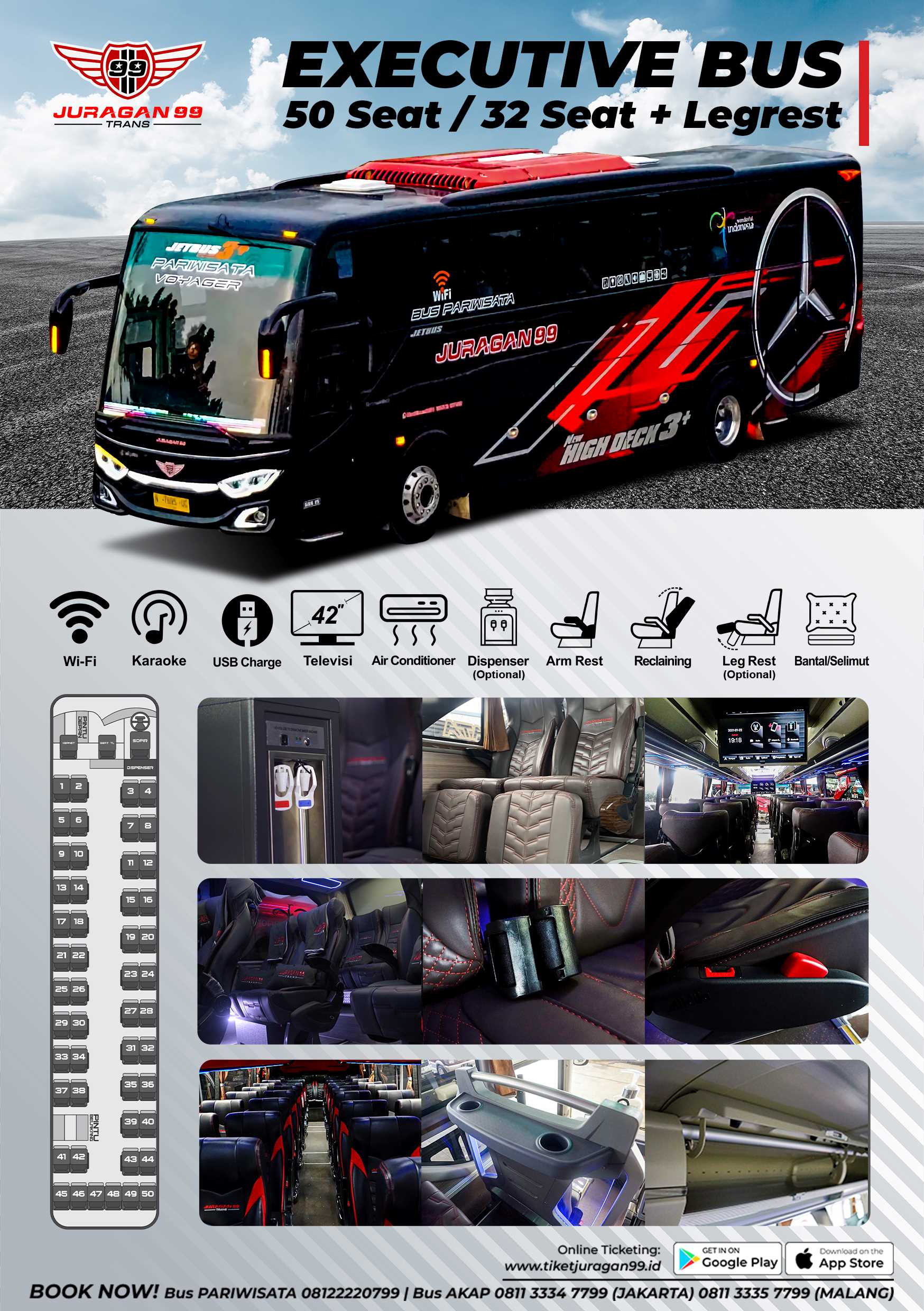 Armada Premium Bus Juragan 99 Trans dilengkapi dengan kursi nyaman beserta Pijakan Kaki, TV Screen, dan layanan Kelas Premium lainnya untuk perjalanan yang menyenangkan.